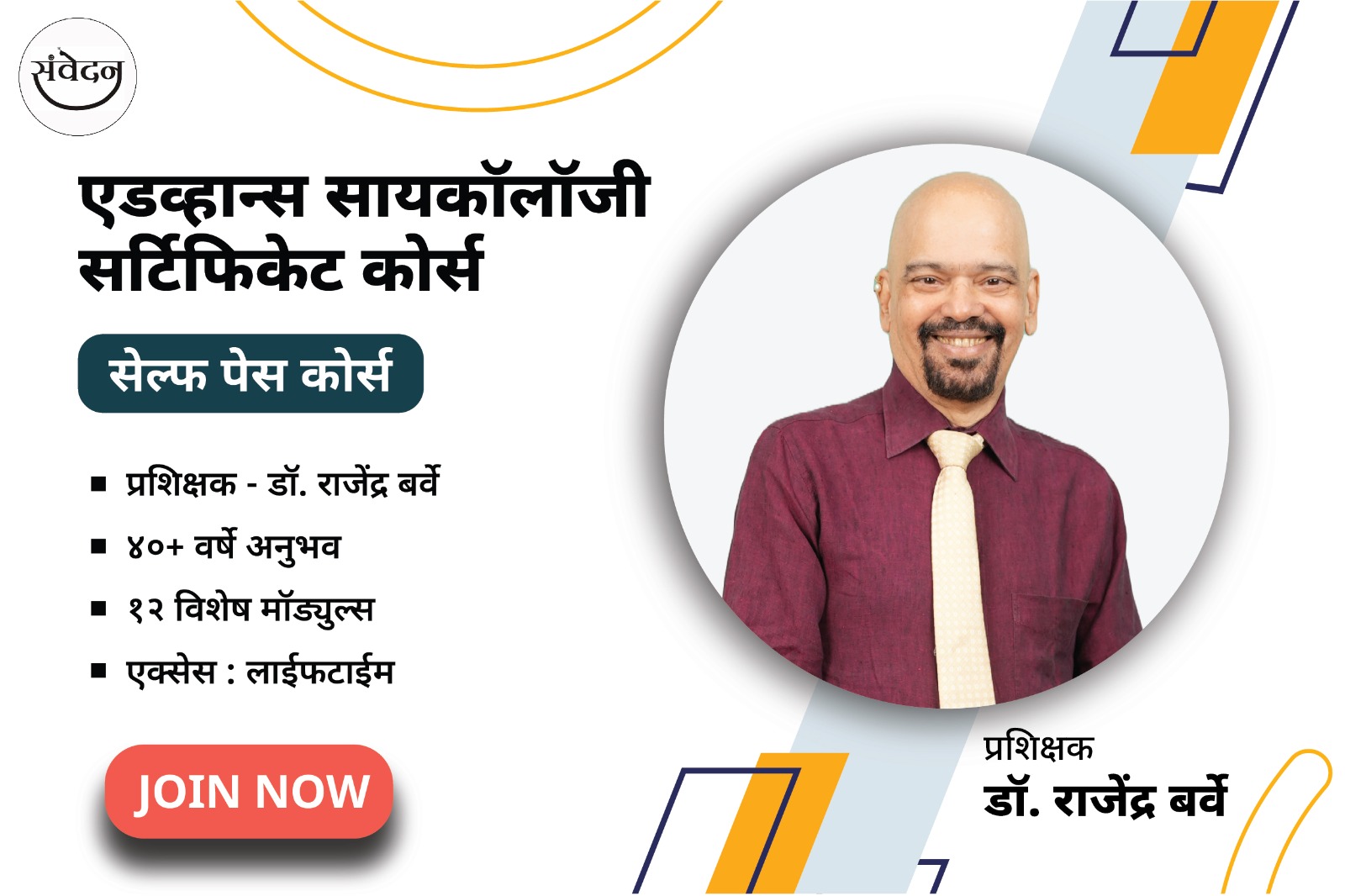 आयुष्यात अडचणींना सामोरे जात असताना त्यातून बाहेर पडण्यासाठी योग्य मार्ग कसा शोधायचा? यासाठी मानसशास्त्राचा अभ्यास आपली मदत करते. दुसऱ्याला स्वीकारण्यासाठी स्वतामध्ये बदल करणे ही तितकेच गरजेचे असते मात्र ते करण्यात अडचणी येतात आणि नात्यात वादविवाद सुरु होतात.. अशा परिस्थतीत कसे वागावे? असा प्रश्न नेहमीच सगळ्यांना पडतो. आज बदलत्या जगामुळे प्रत्येकालाच ताण तणाव, डिप्रेशन या समस्यांना सामोरे जावे लागतंय. पण याचं मूळ आहे बदल. पण हे शिकायचं कसं? मानसशास्त्रामध्ये यावर खूप संशोधन झालेले आहे. हेच ज्ञान शिकण्यासाठी स्कील इंडियाची रजिस्टर पार्टनर असलेल्या संवेदन च्या मानसशास्त्र अभ्यास केंद्राने तुमच्यासाठी हा सेल्फ पेस कोर्स आणला आहे ज्यामध्ये मानसशास्त्रामधील अनेक संकल्पनांचा अभ्यास करून घेतला जाणार आहे.
