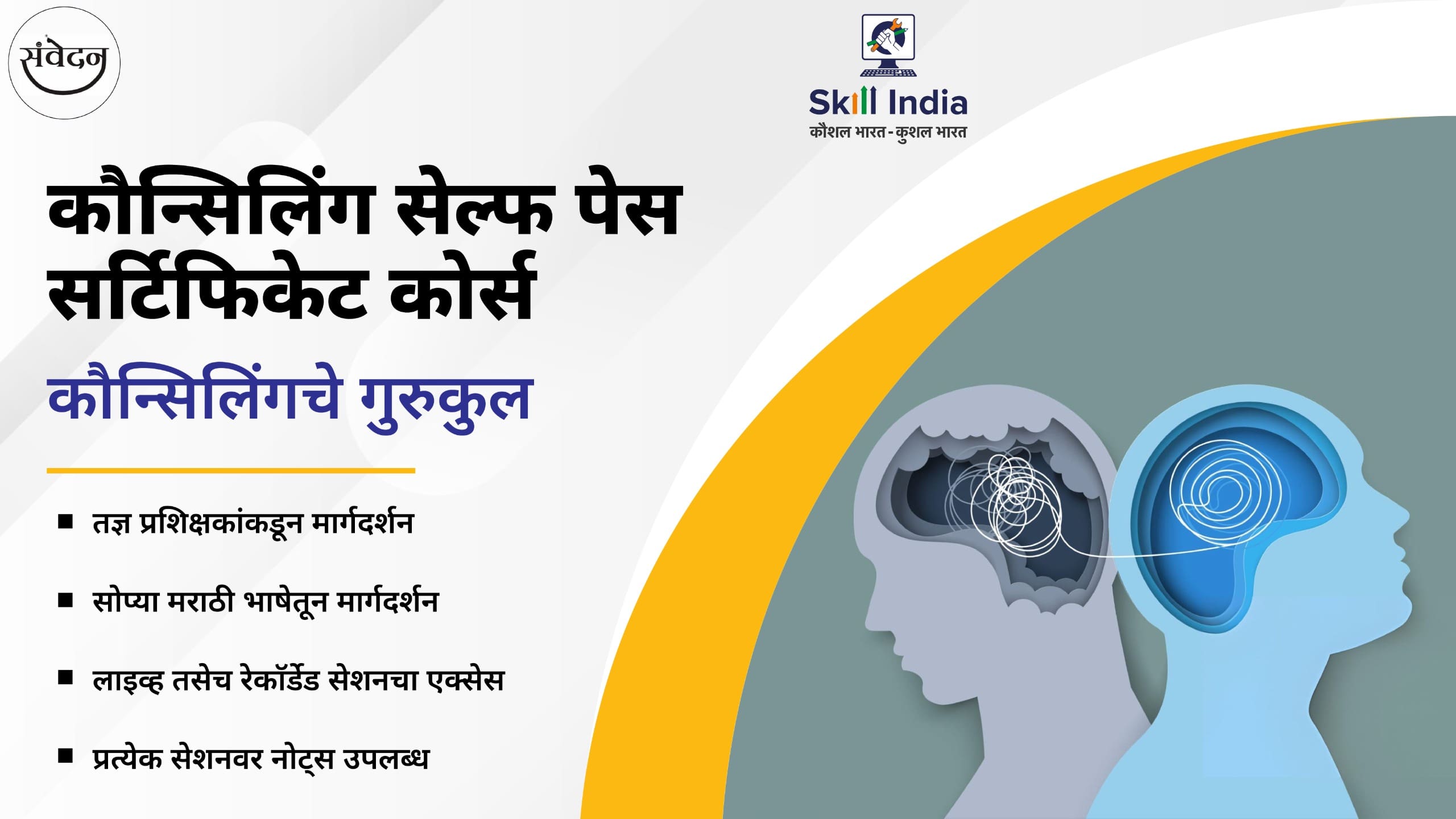 मित्रांनो समुपदेशन शिकण्यासाठी ज्ञानार्जन हा पाया आहे आणि शिकलेले ज्ञान उपदेशाचे डोस म्हणून न पाजता, योग्य निर्णय कोणता हे न सांगता समोरच्यात सामर्थ्य निर्माण करणे हे मानसशास्त्रीय कौशल्य आहे. मात्र हे कौशल्य मानसशास्त्रीय पद्धतीने शिकून आत्मसात करण्यासाठी स्कील इंडिया नोंदणीकृत संवेदनच्या मानसशास्त्र अभ्यास केंद्राने कौन्सिलिंग सेल्फ पेस सर्टिफिकेट कोर्स आणला आहे.